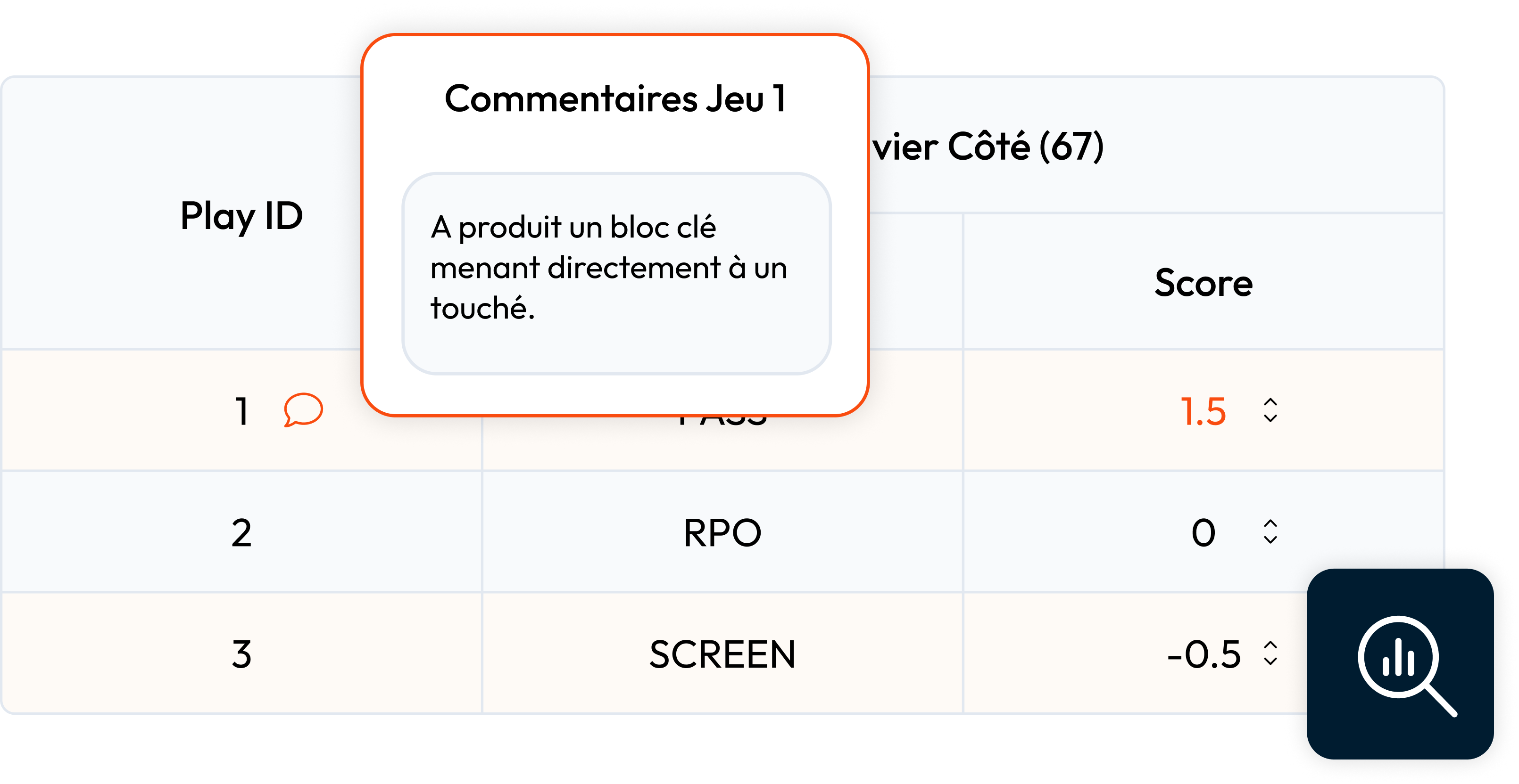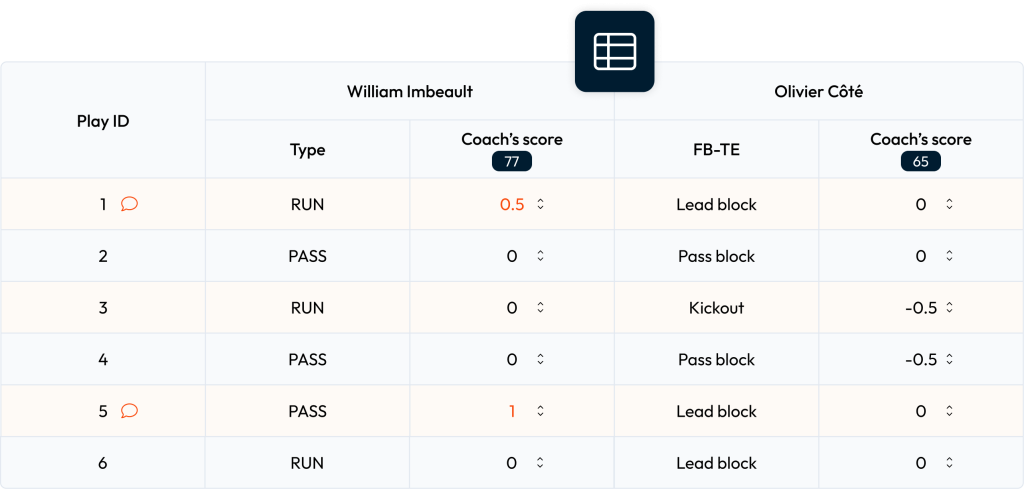Transformez vos observations en donnรฉes mesurables s’appliquant ร toutes les positions grรขce ร notre systรจme de notation intuitif. Obtenez des scores en pourcentage qui reflรจtent fidรจlement les performances de vos athlรจtes.